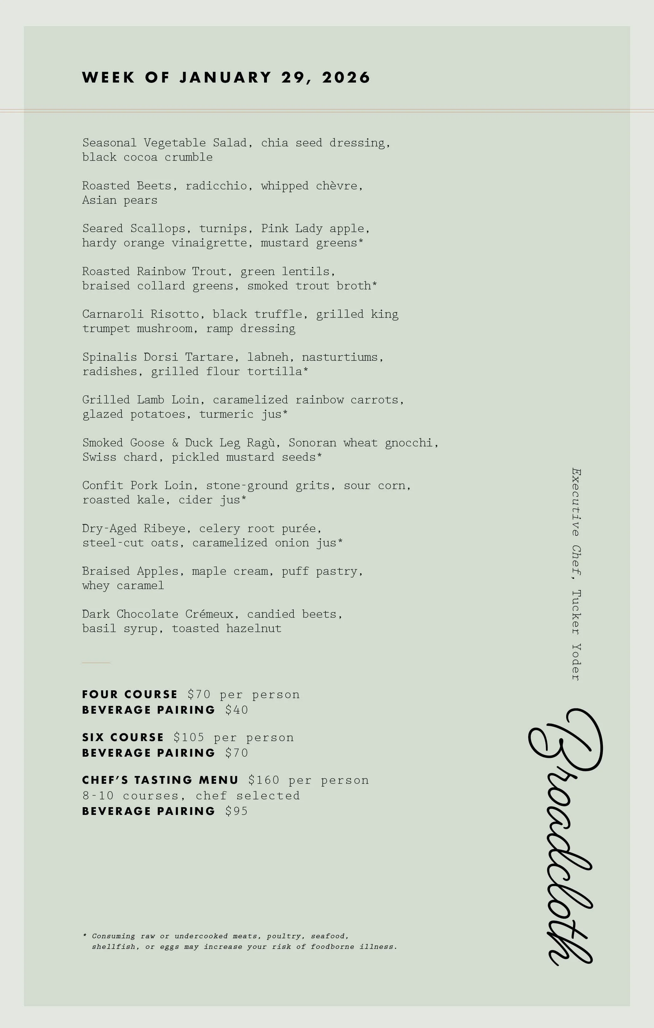 Our weekly tasting menu is crafted by Chef Yoder using the freshest seasonal ingredients from our local purveyors, thoughtfully prepared and refreshed each week.